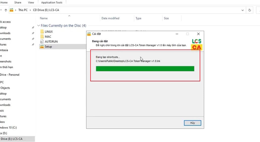 Bước 9: Quá trình cài đặt LCS-CA Token Manager V1.0 đang được xử lý. Trong lúc này quý khách không được mở thêm các ứng dụng/phần mềm khác gây ảnh hưởng đến việc xử lý trình cài đặt chữ ký số Vin-CA.