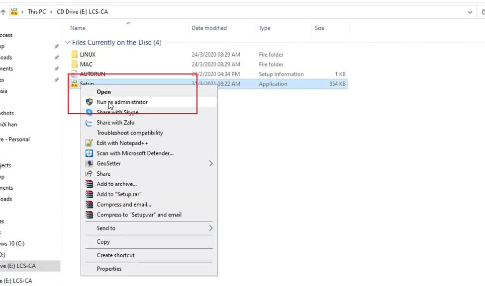Bước 3: Trong thư mục sẽ có 4 file, quý khách chọn file Setup để cài đặt. Click chuột phải file Setup => nhấn chọn Run as administrator.