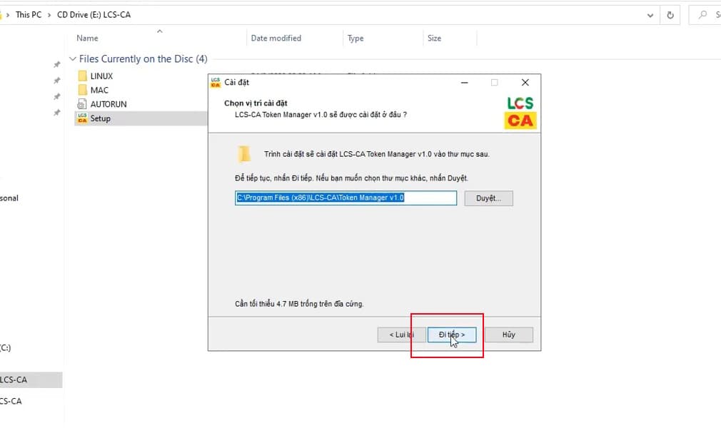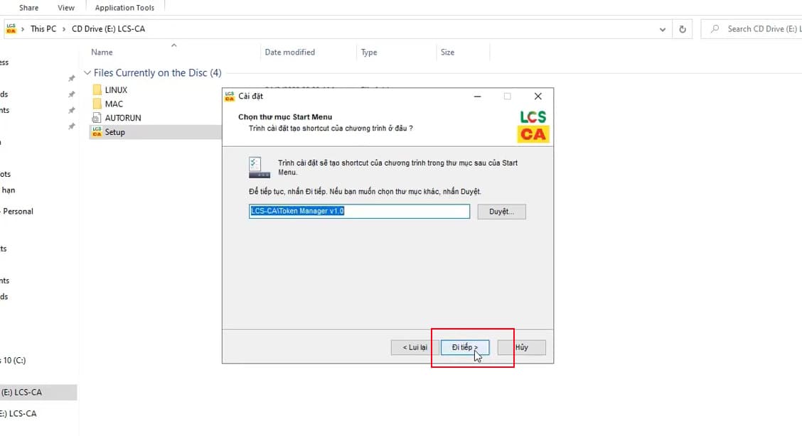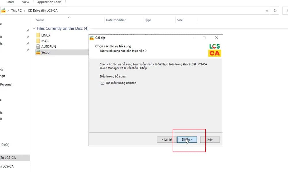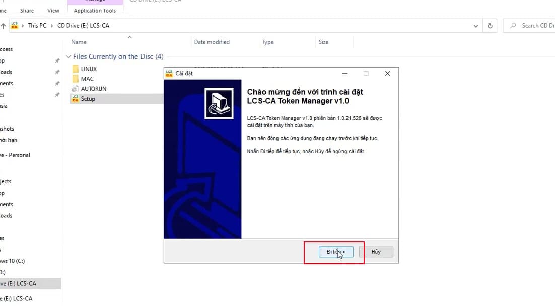 Bước 5: Cửa sổ hiển thị chào mừng đến với trình cài đặt LCS-CA Token Manager v1.0 trên máy tính. Nhấn Đi tiếp > chuyển đến bước tiếp theo.